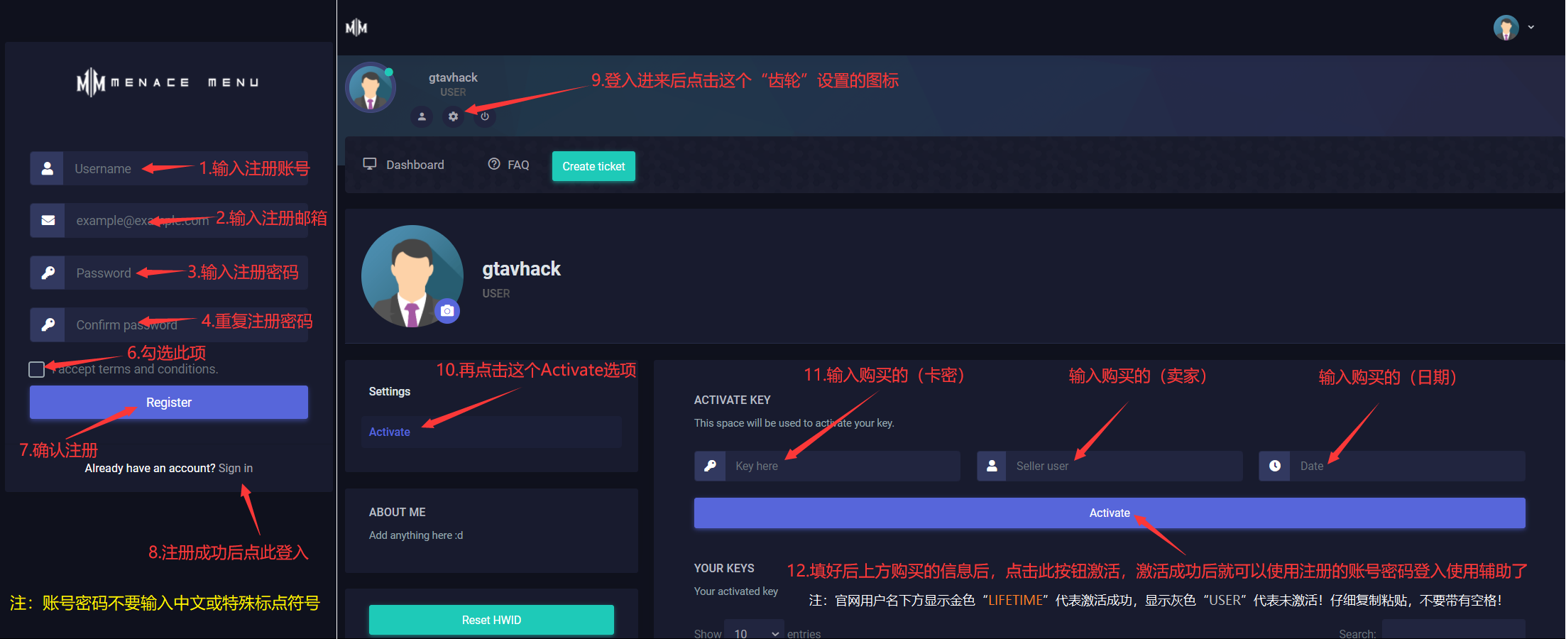 第一步:注册激活账号打开注册网址:https: nfcheats com注册自己的账号密码【不要带中文或特殊标点符号,仅支持 英文+数字】注册好后,